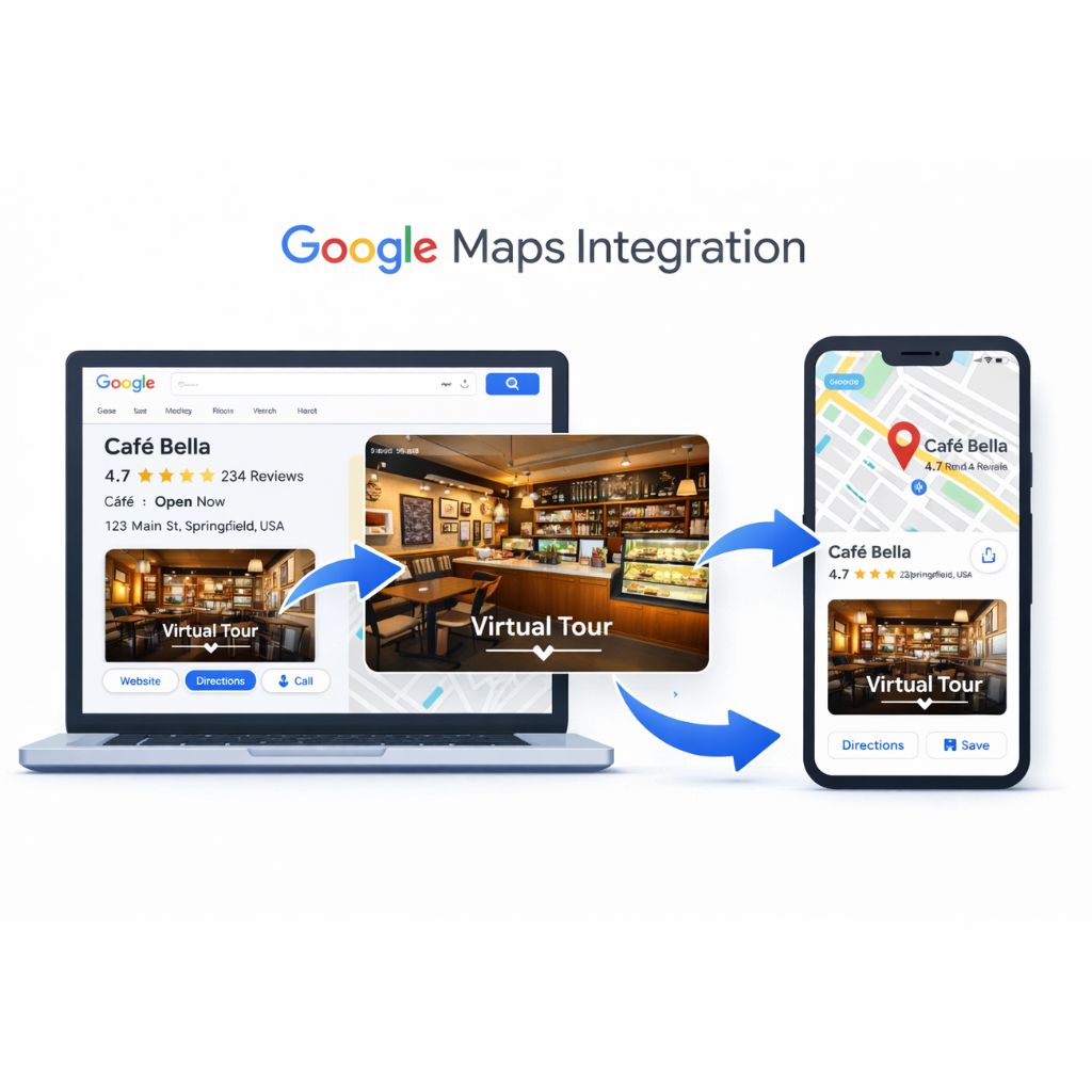 Your virtual tour is seamlessly integrated with Google Search and Google Maps, allowing customers to explore your business directly from your Google Business Profile. This integration improves online visibility, increases engagement, and helps potential customers discover your location easily.
